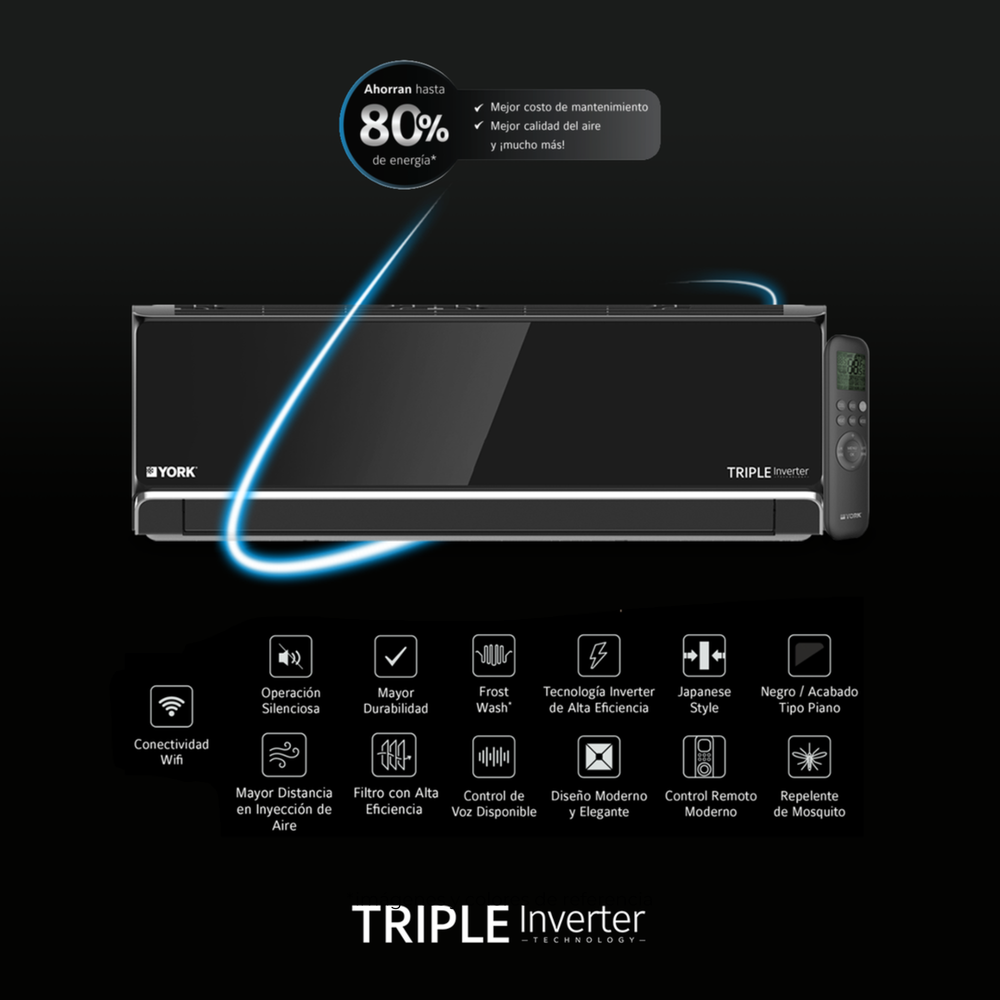 Este modelo opera con refrigerante ecológico R-32, tecnología Triple Inverter y una eficiencia destacada SEER 21, lo que garantiza una climatización precisa, silenciosa y altamente económica. La ingeniería avanzada de YORK permite un mayor control de temperatura, mayor vida útil del equipo y un rendimiento excepcional incluso en condiciones exigentes.